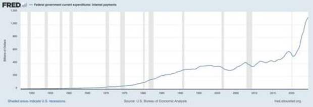 There is nothing inherently significant about the number $36 trillion, but as you can see from the accompanying chart published by the Federal Reserve Bank of St. Louis, the annual cost of the federal debt has exploded from under $600 billion in 2020 to over $1 trillion now.