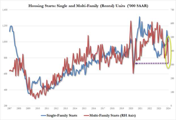 And multi-family starts were even worse, plunging from 489k SAAR to 314k SAAR - the lowest since May 2020 (when the economy was closed)...