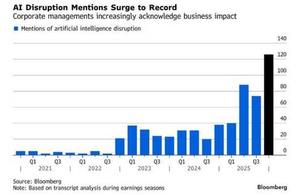 The search for stocks on the right side of the artificial intelligence trade is front and center for investors at the start of a shortened week — with a backdrop that may benefit selective buyers. The “perception of AI seems to have changed completely from the angel of mercy to the kiss of death,” said Stephan Kemper, chief investment strategist at BNP Paribas Wealth Management. Concerns as to whether hyperscalers can monetize ever-growing investments in AI are back while “the fact that AI can often be a tool to enhance profitability is completely ignored,” Kemper added. Two opposing fears are evident - one that AI is poised to disrupt entire industries, the other that investors are skeptical of whether the huge capex outlays will deliver Alibaba unveiled a major update of its flagship AI model, ahead of a much anticipated release from DeepSeek. AI even gets into the Fed’s narrative with Barr due to speak on AI and the labor market, and Daly on AI and the economy later today. returns. And AI is dominating conference calls.