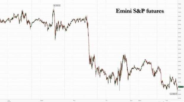 US equity futures woke up after President's Day and chose to resume their selloff (after a modest bounce on Monday's holiday failed to hold) dragged by Tech, as the risk-off moves on AI disruption fears continue. As of 8:15am ET, S&P 500 futures were down 0.