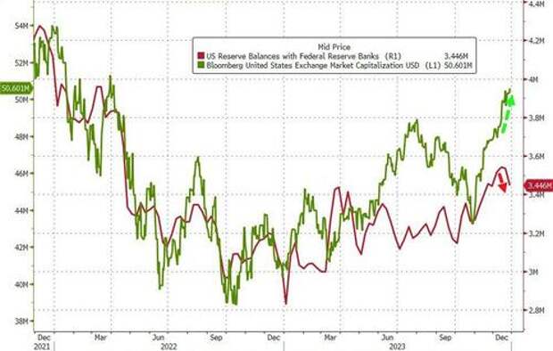 Finally, equity market caps continue to soar after recoupling with bank reserves at The Fed (though the stalling in the drawdown of the RRP has slowed the expansion again this week in a bigger way)...