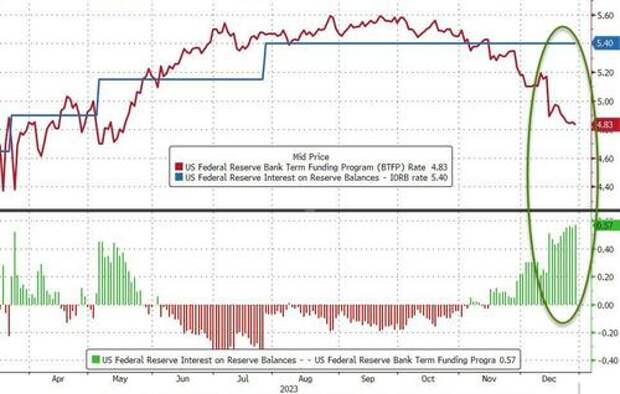 For institutions that have an account at the Fed, they can borrow from the BTFP at 4.83% and park that at the central bank to earn 5.40% - the interest on reserve balances.