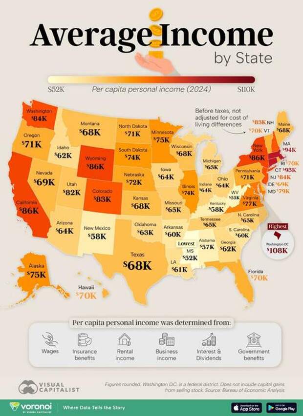 This map lists states by their per capita personal income, showing where residents, on average, earn the most.