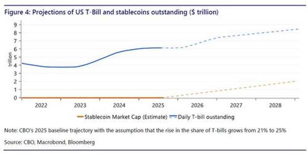 Figure 4 shows projected T-Bill issuance going forwards along with projected demand for USD stablecoins, which is estimated to hit $2 trillion in 2028. Note the debt path for T-Bills uses the CBO’s 2025 baseline trajectory with the assumption that the rise in the share of T-bills grows from 21% to 25%