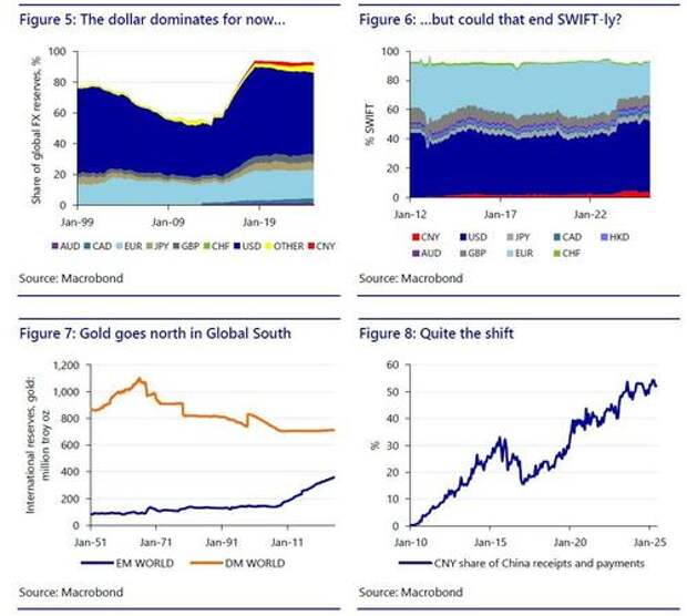 While issuing more short-term debt in high-debt economies is often associated with a weakening currency over time, USD stablecoins reinforce the US dollar’s global reserve FX status. Markets have been questioning this in the face of US deficits and debt, its aggressive sanctions on Russia, its retreat from the global economic and financial architecture it built, and rivalry within the current global system from Europe/the euro, and from the BRICS economies pushing non-SWIFT CNY, ‘BRICScoin’, or gold alternatives (Figures 5-8). Note we have written on before and remain sceptical of purported dollar replacements, but dollar avoidance is certainly taking place via de facto barter, with goods priced in dollar not used.