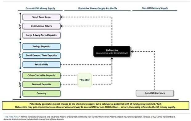 There is debate about whether or not stablecoins will result in an increase in the money supply. The Treasury states stablecoins “Potentially generate no net change to the US money supply, but catalyze a potential shift of funds away from M1/M2. Stablecoins may gain momentum as a store of value and way to access USD for non-USD holders – in turn, increasing inflows to the US money supply.” We argue the clearer dynamic is a change in ‘moneyness’. Essentially, USD stablecoins convert US debt like T-Bills/Repo (narrow inside money) into spendable cash (outside money). Holders might not be able to buy goods and services with a T-Bill, but they can with a stablecoin.