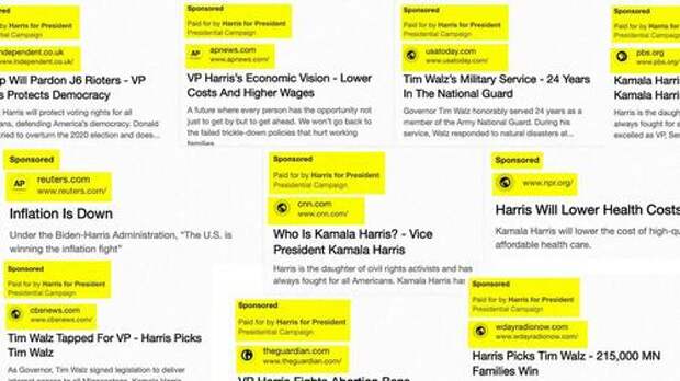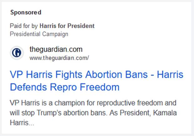 - For example, an ad that ran alongside an article from The Guardian shows a headline that reads "VP Harris Fights Abortion Bans - Harris Defends Repro Freedom" and then includes supporting text underneath the headline that reads, "VP Harris is a champion for reproductive freedom and will stop Trump's abortion bans."