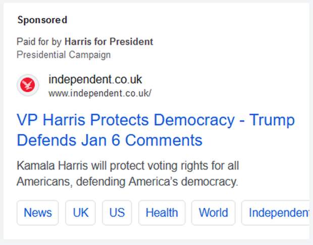 A source familiar with the Harris campaign's ads team said the campaign buys search ads with news links to give voters searching for information about Vice President Harris more context.