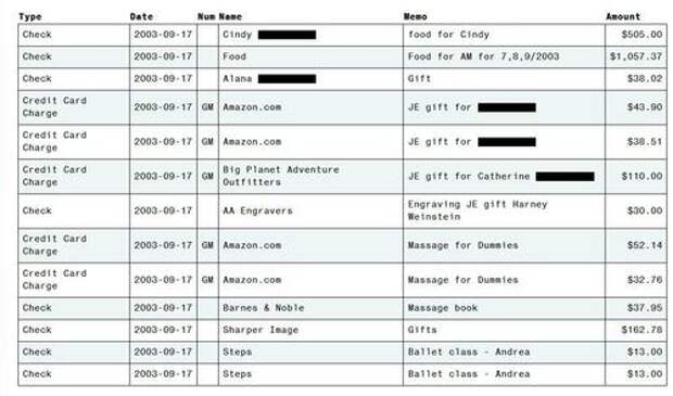 Grooming & control mechanics: The spending file shows a cadence of small, frequent items - lingerie, “Massage for Dummies” books, classes, rent, electronics - that reinforced dependence. Examples include a $496 gift card at a New York lingerie shop for two assistants, $1,200 for a Thai-massage course, $3,328 for laptops to two young women listed as assistants/victims, a $3,725 study-abroad check, and multiple Western Union wires.