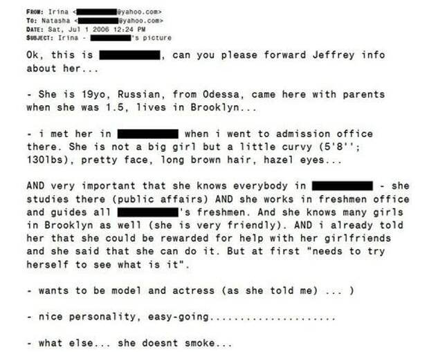 Sourcing & screening: Maxwell and selected associates identified prospects through social circles and schools. Emails from Natalya (“Natasha”) Malyshev to Epstein carried first names, ages and photos; one message proposed a 19-year-old who could “be rewarded” for recruiting classmates. Epstein responded that she was “too big,” adding instructions (“no nail polish”) if a meeting went ahead.