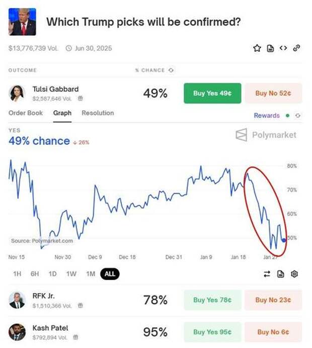 PolyMarket odds sank notably during Tulsi's hearing yesterday...