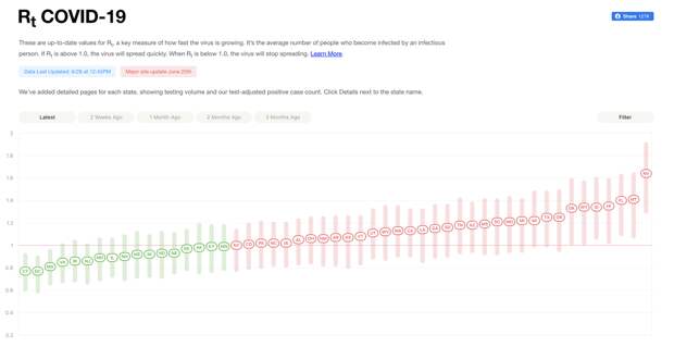 Instagram Founder Kevin Systrom also appeared on CNBC this morning to share data from a public COVID-19 tracking platform he's launched, which features this nifty display showing where each state's rate of spread is relative to the spectrum seen since the beginning of the pandemic.