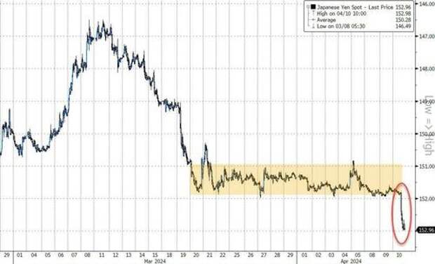 The Bank of Japan has a real problem now as USDJPY surged up to 153 - a fresh 34-year-low for the yen against the dollar and below the level at which the BoJ last intervened...