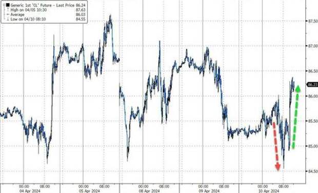 Oil prices bucked the trend today thanks to a spike in geopolitical tensions. The initial dump on CPI was worsened by a bigger than expected crude draw but then Iran-Israel missile headlines sent prices soaring back above $86 (WTI)...