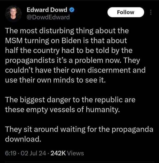 Does any of the daily drama regarding Biden’s senility or Zelensky’s acting abilities fronting the U.S. war against Russia matter? To me it seems like theater, designed to confuse, distract, and obscure what is really happening behind the curtain, where the real people running this world are plotting their next move in their never ending war on humanity, family, and freedom. With a vast swath of the populace too dumbed down, propagandized into subservience, and sheep-like in their adherence to regime media narratives, does it matter what I say, do, or write? Ed Dowd has little faith in humanity, and I agree with him.