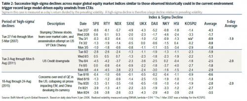 Looking back at history, Bowler observes that should equity markets decline in similar fashion to the one week periods from late Feb- 07, the Aug-11 US credit downgrade, or the Aug-15 sell-off then according to our model CTAs would unwind mostly all of their global equity positions to limit losses.
