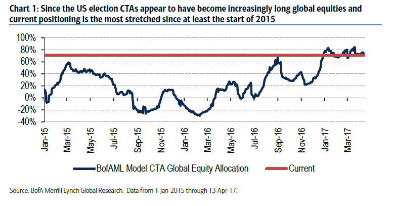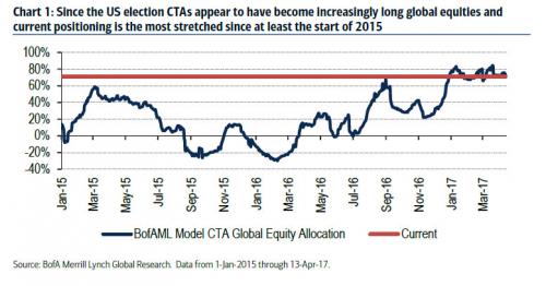 According to Bank of America, a combination of upward trending global equity markets with very low volatility have "conspired to push trend following CTA (Commodity Trading Advisor) equity positioning to near record levels. As the chart below show, CTAs have outsized, near-record positions in global equities."