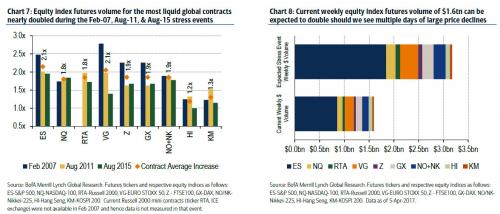 Further, as we’ve noted in the past, equity futures market liquidity is not only measured by total volume but also market depth which in recent risk-off events has declined in times of vol shocks. The greater the selling pressure that is concentrated in a shorter time period against falling market depth (when liquidity is needed most) could also further exacerbate market shocks.