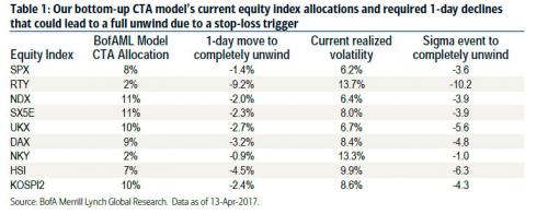 Tying back to our warning from March, BofA then writes that "for CTAs who are risk controlled, which we think most are, in the current environment it could take a relatively smaller equity market decline to trigger rules-based selling pressure. However, as different CTAs have varying sets of rules and risk control mechanisms, the selling pressure may not necessarily occur simultaneously or even within the same day."