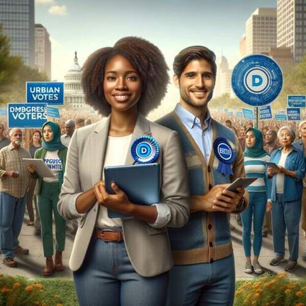 What does a Democratic voter look like? According to ChatGPT, the “key values” of Democratic voters are “diversity, education, technology, inclusivity, and a focus on environmental and social issues,” with the image centering on “a young African American woman in professional attire and a Hispanic man in casual attire. The woman’s professional attire and the book and digital tablet she holds symbolize the Democratic values of progressive ideals, education, and technological advancement. The man’s casual attire represents inclusivity and grassroots activism.”