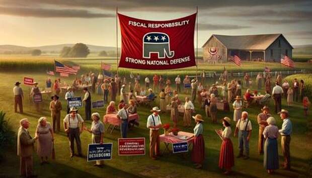 In contrast, the image below shows the Republican Party, with ChatGPT explaining that “the serene rural setting represents traditional values and a connection to the land . . . associated with the Republican Party’s emphasis on rural communities and agricultural interests, highlighting a respect for tradition and simplicity,” and notes the “stereotype that the party only represents a specific segment of the population” and that the “core principles of the Republican Party, focu[s] on conservative fiscal policies, a robust approach to national security, and the protection of personal liberties.