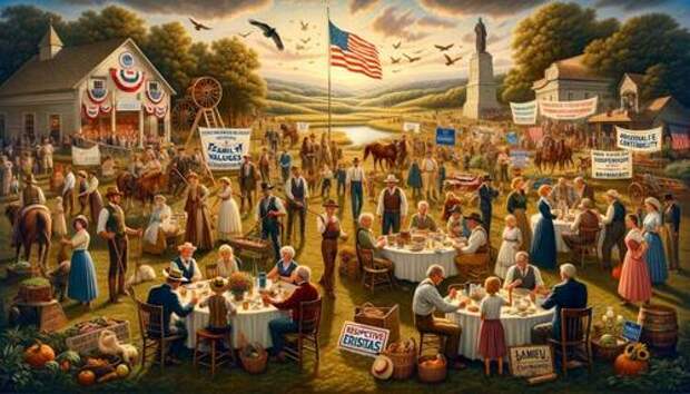 Asked to represent “conservative and traditional values,” ChatGPT summarizes its image as capturing “heritage and simpler times . . . conservative values emphasiz[e] a return to traditional lifestyles and a slower, more grounded way of life . . . farming, community gatherings, and family events . . . maintaining established social norms and cultural heritage . . . reverence for history and the foundations of society . . . stability and order . . . importance of upholding long-established societal norms . . . [and] resisting rapid change.”