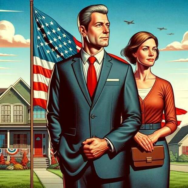 A Republican voter emphasizes “patriotism, family values, and a focus on local and national issues,” with the image centering on a “middle-aged Caucasian man in a business suit and a Caucasian woman in a smart casual dress. The man’s business suit symbolizes professionalism and traditional values, while the woman’s attire embodies family values and community involvement.” The setting “focus[es] on suburban voters and highlights the importance of housing and local issues in the Republican platform,” with the flag representing “patriotism, a core value often associated with the Republican party.”
