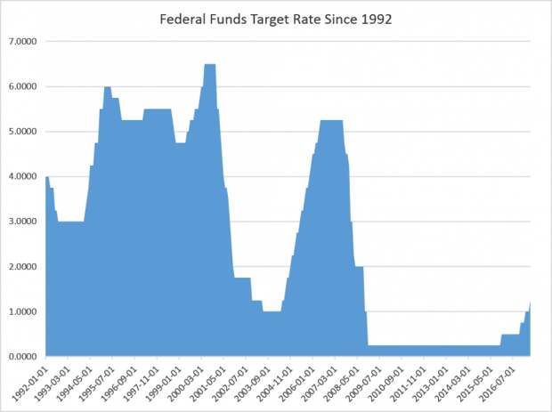 Since 2009, the target rate has been at rock-bottom rates. Over the past year, the Fed has raised the target rate from 0.5 percent to 1.25 percent, but this has only gotten the rate back up to where it was when it was attempting to stimulate the economy in the wake of the dot-come bust in 2001.