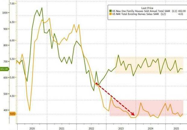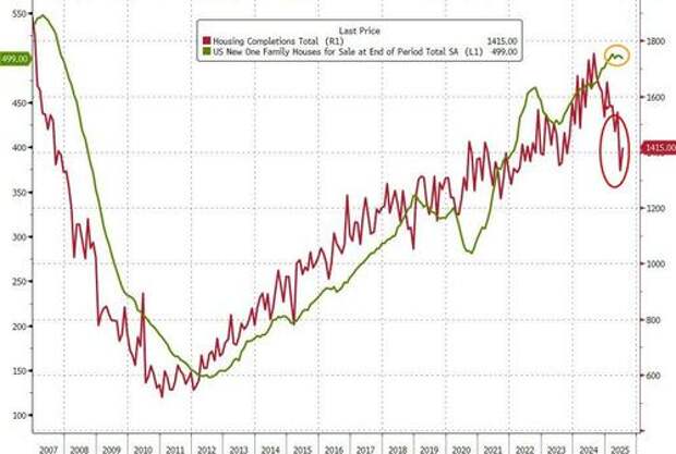 Homebuilder pain is obvious in this chart as completions plunge thanks to existing home inventory holding at its highest level since 2007...