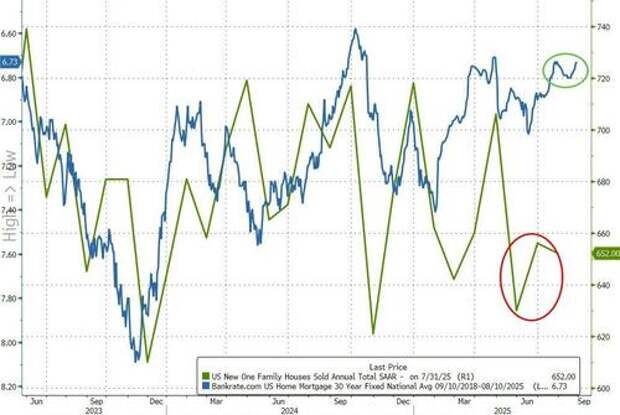 Rate cuts have steepened the yield curve and pushed mortgage rates up; but as the chart above shows, the relationship between new home sales and actual mortgage rates has decoupled in recent weeks. ..