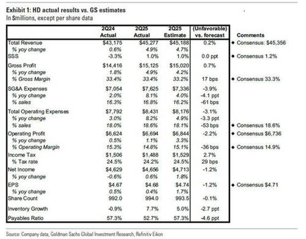 28 billion from $43.18 billion, but fell short of the $45.41 billion estimated by about 30bps. Gross margins beta by 20 bps and operating margins were largely in-line. Comp store sales rose 1%, also missing the 1.3% estimate. In the U.S., comp store sales increased 1.4%. According to Goldman, "comp sales were about 30 bps light and exactly what almost all previews and inbounds suggested." While customer transactions declined ~1% in the quarter, the amount shoppers spent rose to $90.01 per average receipt from $88.90 in the prior-year period.Q2 EPS of $4.68 also missed consensus $4.72. The company earned $4.55 billion, or $4.58 per share, for the second quarter. A year ago, the Atlanta-based company earned $4.56 billion, or $4.60 per share.