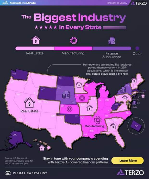 This Markets in a Minute graphic, via Visual Capitalist's Jenna Ross, in partnership with Terzo, highlights the industry contributing the most to GDP in every state.