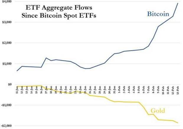 Since Spot Bitcoin ETFs were launched, Gold ETFs have in aggregate seen almost $2 billion in net outflows while Bitocin ETFs have seen net inflows of almost $4 billion...