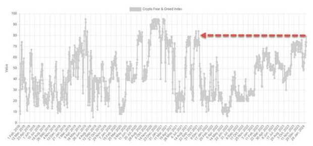 However, one word of warning: the 'Fear & Greed Index' for Bitcoin, which aggregates data on market momentum, volatility, volume and social media, is now at 79 out of 100, its highest score since Bitcoin reached $69,000 in November 2021.