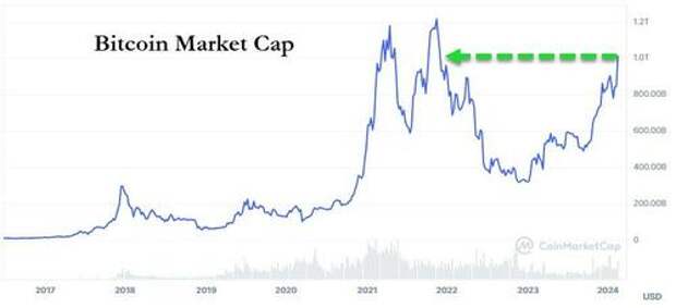 The total market value of Bitcoin's circulating supply crossed $1 trillion today for the first time since November 2021...