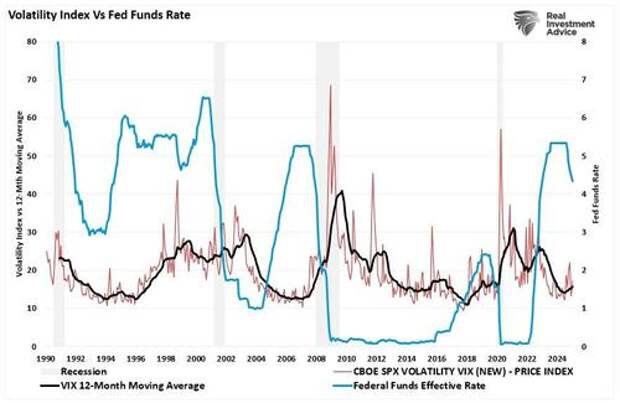 These periods of stability have always led to high levels of investor complacency concerning risk. However, historically speaking, such periods of complacency are often built on rationalizations with weak underpinnings. Investors are confident that the Fed will continue cutting interest rates, easing monetary policy, and supporting higher future stock valuations. However, that expectation may be misguided as the Fed remains unconcerned about any near-term recessionary impact. However, policy actions by the current Administration to reduce the deficit, cut Government employment, and impose tariffs are factors that could slow economic growth rates more than anticipated. Such is particularly the case now as evidence of weakening employment and consumers is emerging.