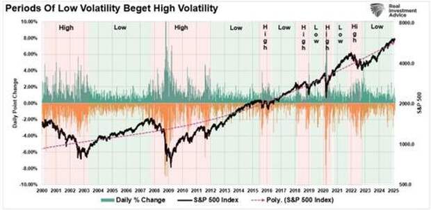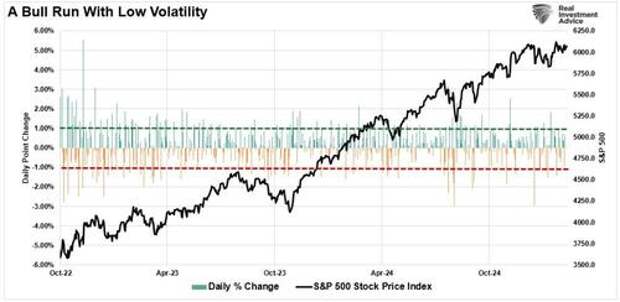 Stability is acceptable until something occurs that causes instability. Since October 2022, the market has steadily risen despite higher interest rates, inflation, and slowing economic growth. Changes to the Fed’s outlook, or as recently as tariffs and Deepseek, have caused market pullbacks. However, market stability has primarily been contained to a relatively narrow range of +/- 1% in daily price movements.