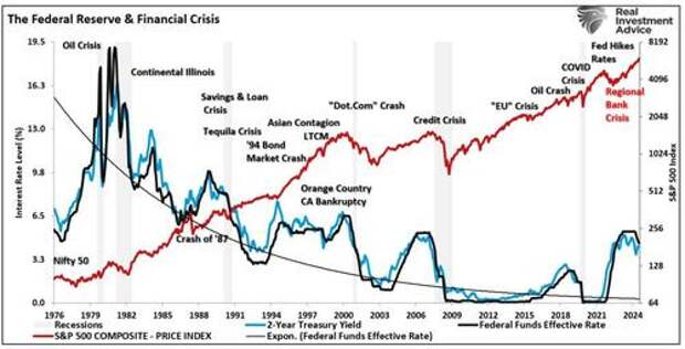 The Fed is highly dependent on this assumption as it provides the “room” needed to navigate the risks that have built up in the system. The risks of something breaking have increased substantially from elevated market valuations to exceptionally low credit spreads. As we saw in March 2023, the rise in interest rates nearly took down the regional banking sector until the Federal Reserve was forced to step in with the “Bank Term Funding Program.” Fortunately, that banking risk did not become a financial contagion, and the Federal Reserve maintained stability across the markets.