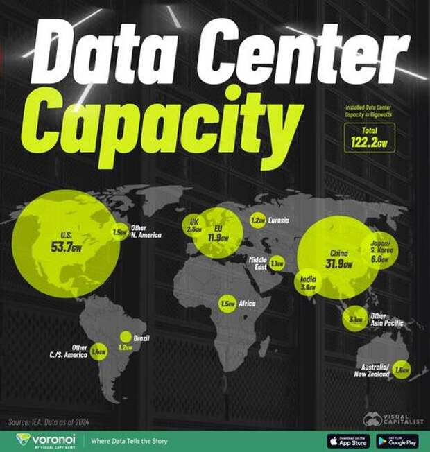 This graphic, via Visual Capitalist's Dorothy Neufeld, shows data center capacity by region, based on data from the IEA.