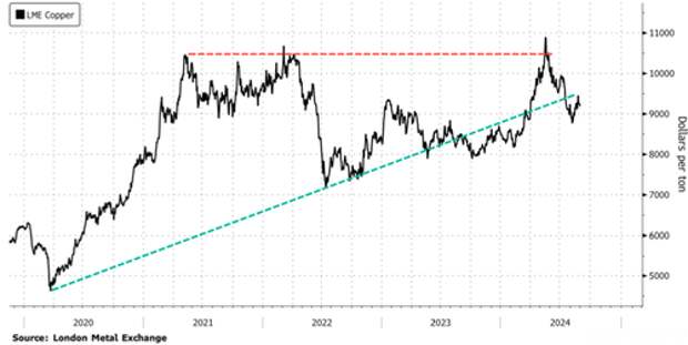 The analysts delayed their end-2024 copper target of $12,000 a ton to post-2025, implying a 2025 copper forecast of $10,100 a ton, still above current prices on the London Metal Exchange of around $9,200 but below previous estimates of $15,000.