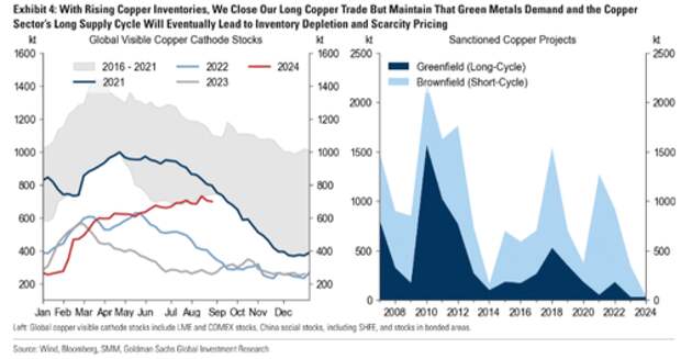 Further, given rising global visible copper inventories summer to date and the ongoing China growth concerns, we take this opportunity to close our long-standing long copper trading recommendation with a potential gain of 41% and will look to potentially re-open this trade at a later time. We maintain our structural view that green metals demand growth and the long-cycle's nature of copper supply, along with its declining investment, will ultimately set the stage for inventory depletion and, hence, scarcity pricing.