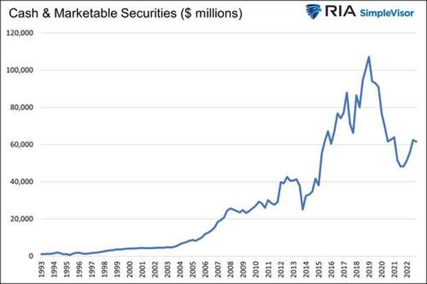 Cash and Marketable Securities on Apple’s balance sheet are at $61.5 billion, about a year’s worth of buyback potential. While a massive amount of money, it is off its peak of $107 billion.