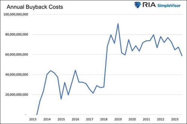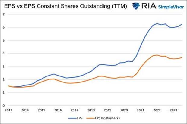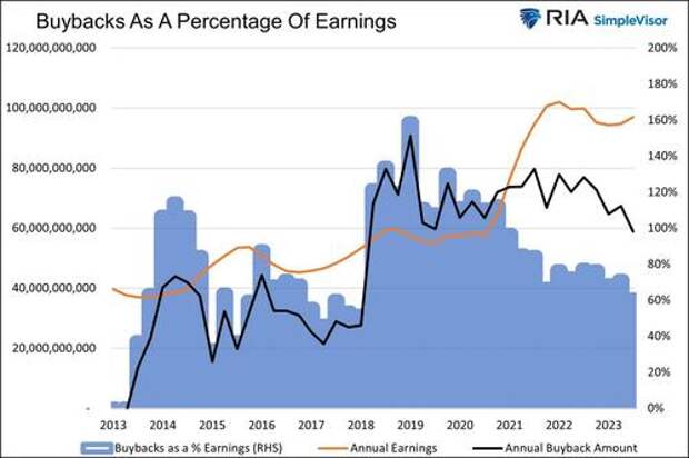 Over the last two years, buybacks only account for 60% of earnings, allowing cash to grow for future buybacks and investments. Hence, if $100 billion a year in earnings is sustainable, even without growth, $60 to $80 billion a year in buybacks is entirely possible. If earnings retreat to their pre-pandemic level, debt and cash will be required. If interest rates stay at their current levels, debt may not be financially sensible.