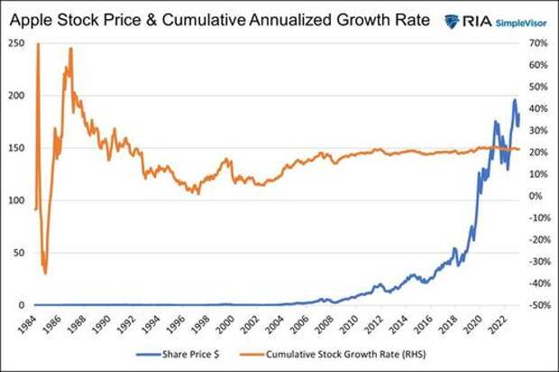 The graph below shows Apple shares have provided its investors with a fantastic 20% annualized growth rate for the last 39 years. That is more than double the 8.7% growth rate for the S&P 500 over the same period.
