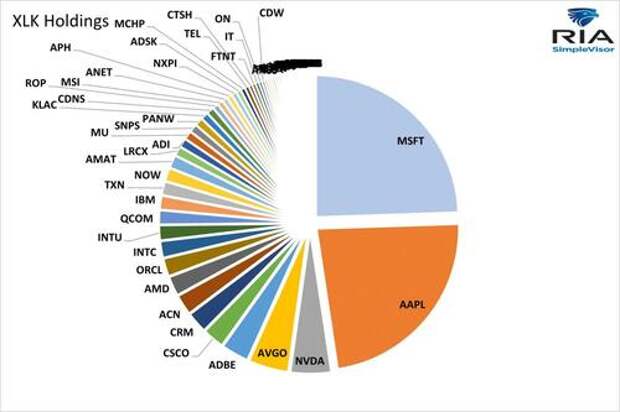 Consider the holdings of XLK, the $52 billion tech sector ETF. Apple and Microsoft make up almost 50% of the ETF. If an investor buys $1,000 of XLK, approximately $500 will go to Apple and Microsoft, and the remaining 62 companies will get the rest.