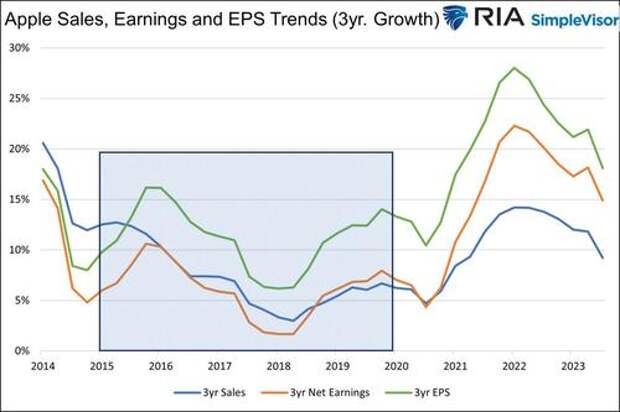 However, Apple’s earnings and sales growth are returning to pre-pandemic levels. To better appreciate what the future may hold, consider the five pre-pandemic years highlighted in blue. During that period, sales grew by 4.2% annually. Net earnings grew by 4.3% and EPS by 10.4%
