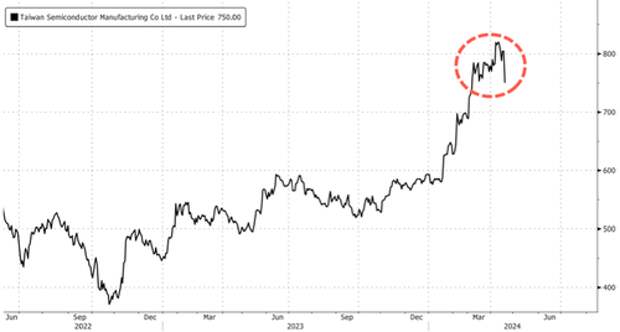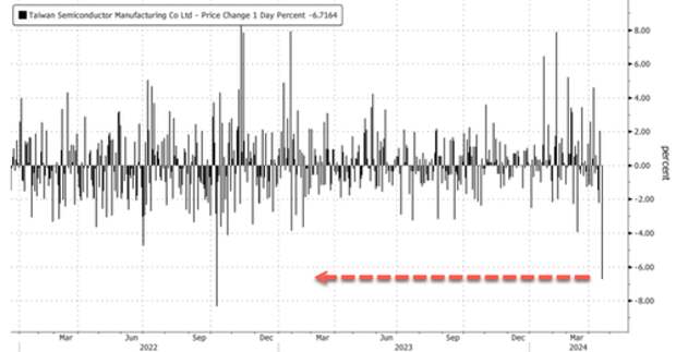 Aside from the earnings, TSMC's downshift in this year's industry outlook spooked the market, sending shares down as much as 7.2% in Taipei.