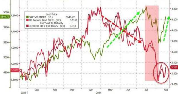 Finally, while stocks are soaring back higher (because 'no recession' and 'slow-flation' - goldilocks), bonds and rate-cut expectations are not playing along (flashing recessionary signals)...