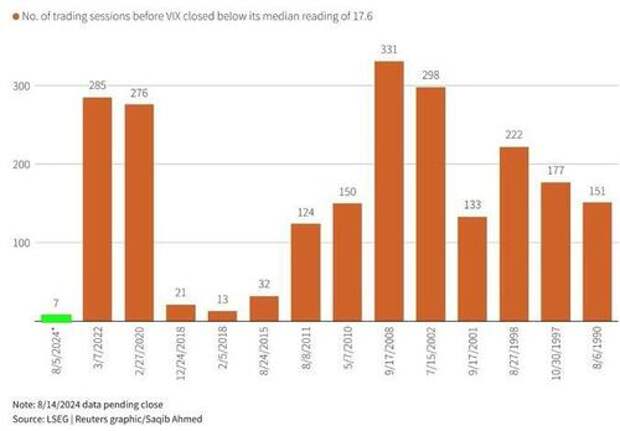 Bear in mind that historically, when the VIX has risen to close above 35, as it did on Aug. 5, the index has taken 170 sessions on average before returning to 17.6, its long-term median... not 7 days!