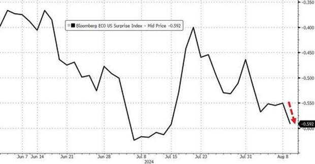 .. and homebuilder sentiment slumped... and the Philly Fed business outlook plunged... and the Empire Fed Manufacturing survey remains in contraction for the 9th straight month... and import and export price inflation was hotter than expected... all of which sent the macro surprise index down to 2024 lows...Source: Bloomberg